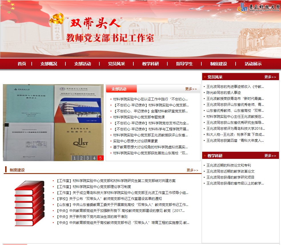 在高校“双带头人”教师党支部书记工作室的建设中,材料公司实验中心党支部抓好党建主责主业,强化支部政治功能,提升思想政治工作质量,促进公司事业发展,抓好支部班子建设。为了发挥“双带头人”工作室“样板田”、“示范区”作用,促进“双带头人”工作室更好开展理论研究和实践探索,示范引领、辐射带动教师党支部建设和教师思想政治工作质量整体提升,bv伟德中国官方网站材料公司实验中心党支部书记工作室建设了“山东省高校“双带头人”教师党支部书记工作室”网站(https://sdtr.qust.edu.cn),为更好地实现“双带头人”工作室的示范作用,发挥了重要的作用。