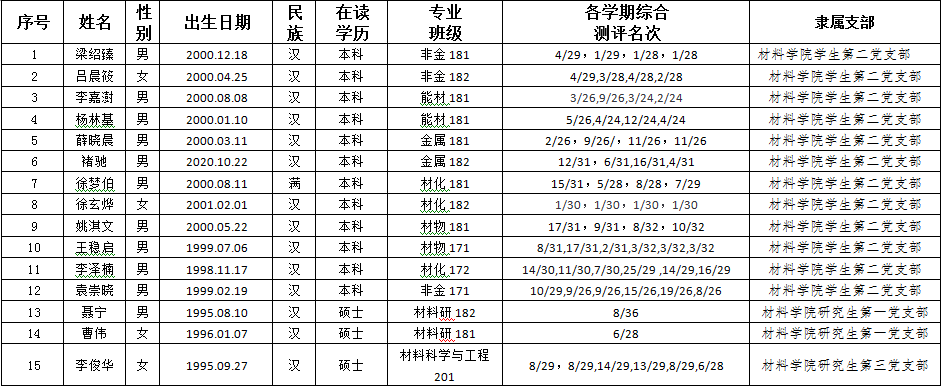 经支部研究,公司党委备案同意,将梁绍臻等15名同志列为发展对象。根据发展党员工作有关要求,现将有关情况公示如下: