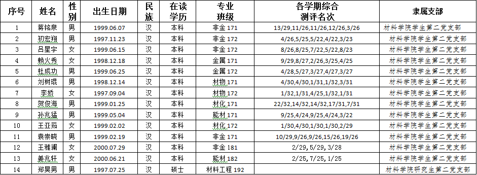 经支部研究,公司党总支备案同意,将蒋铭泉等14名同志列为发展对象。根据发展党员工作有关要求,现将有关情况公示如下:
