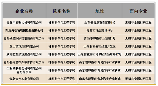 实习包括有认识实习、金工实习、生产实习和毕业实习。公司针对无机非金属专业建立了青岛海铁玻璃钢船艇有限公司、青岛中齐耐火材料有限公司等多个校外实习基地(表1):