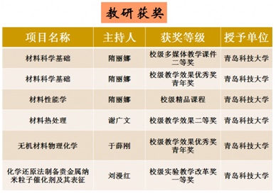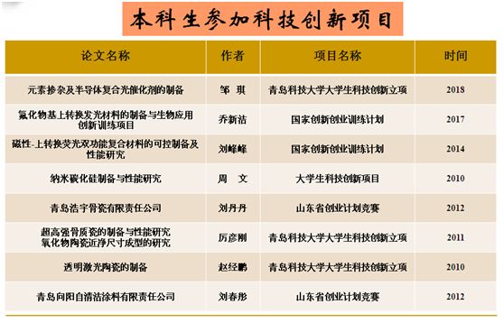 近5年来本专业教师承担科研项目共10余项,科研经费300余万元,其中国家级科研项目5项,省部级各类基金项目6项,横向课题3项。发表研究论文100余篇,其中SCI、EI等收录60余篇,申请国家专利10余项。无机非金属教研室教师在教学过程中始终坚持“教源于研而胜于研”这一理念,坚持以人为本,坚持教学中心地位,以教学促科研,以科研反哺教学,教师教学、科研成果融入课堂教学,改进教学方式,激发员工科研兴趣,促进员工创新能力的提高,提高本专业员工的教育质量,充分发挥科研优势,搭建科技创新平台、学术交流平台和创业训练平台,让平台催生成果,是培养创新型人才的一大法宝,针对无机非金属专业的本科员工,我们鼓励员工积极参与老师的科研课题。员工积极参加无机非金属教研室的开放实验,积极申请老员工科技创新项目,并取得了丰硕成果。