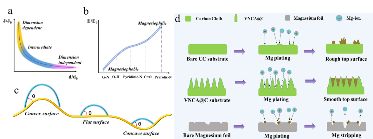2)化学吸附效应:在原子尺度下,电沉积载体的化学状态对金属原子亲和能力是控制金属优先形核和均匀形核的关键。由SP2杂化碳组成的平面六元环碳载体(石墨烯模型)表现出憎镁性,这不仅导致较高的成核势垒,也是造成不均匀的镁沉积主要因素之一。在碳基载体上引入含氮、氧等杂原子的缺陷位点可大大提高其对Mg原子的亲和力,从而大大降低了其电沉积形核和生长能垒,此外,丰富的亲镁中心可以引导均匀的电沉积形核和生长过程,因此电极呈现出较低的沉积/溶解过电势。