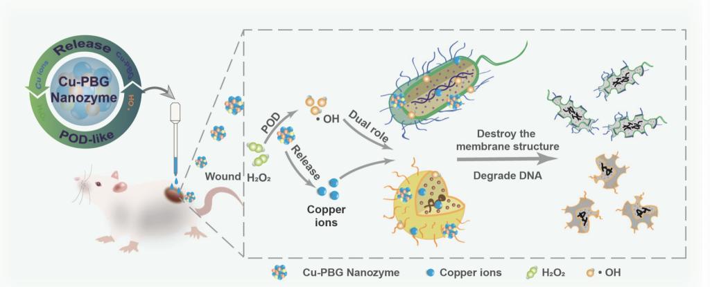 团队成员通过简易的水热法制备非晶可降解含铜磷酸盐玻璃(Cu-PBG)纳米酶,该纳米酶在体内和体外对革兰氏阳性菌和革兰氏阴性菌均有良好的抗菌效果。研究指出,Cu-PBG纳米酶的抗菌机制是基于活性氧(ROS)风暴的产生和铜离子的释放。在微酸性伤口组织中Cu-PBG纳米酶表达过氧化物酶(POD)活性,通过催化H2O2分解为羟基自由基(·OH),对细菌产生致命的氧化应激杀伤。而在中性的生理环境中,则表达过氧化氢酶(CAT)活性,避免了氧化应激对正常组织的损伤。与传统的纳米酶不同,Cu-PBG纳米酶由于其磷酸盐玻璃性质,本质上是可降解的。在微酸性和中性的生理环境中都可实现降解,并释放铜离子,进一步提高了细菌杀伤效果,且避免了无机纳米粒子在体内的长期滞留,具有优秀的生物相容性。体内伤口愈合实验结果也证明了其优秀的体内杀菌、消退炎症、促进伤口愈合的性能。该工作合成了一种高效的含铜抗菌药物,具有巨大的临床转化潜力,对探索新型含铜抗菌剂和开发新的抗菌策略具有重要意义。