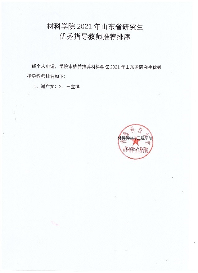 材料公司2021年山东省研究生优秀指导教师推荐公示