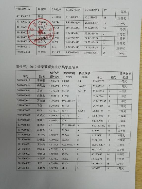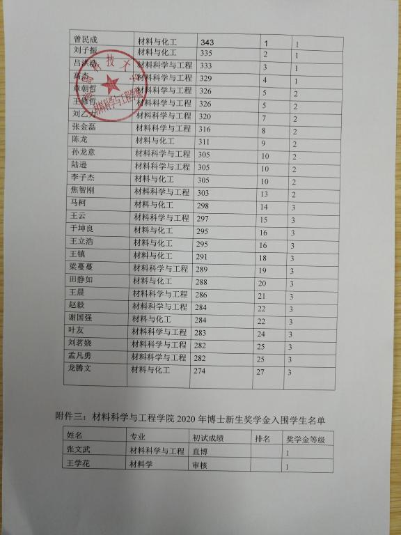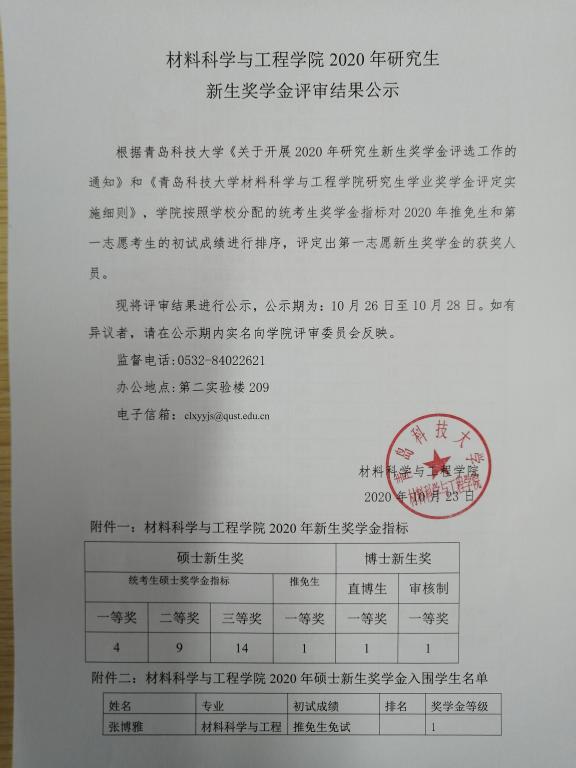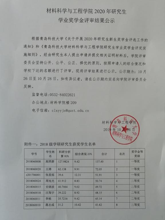 材料公司2020学年研究生学业奖学金和新生奖学金公示