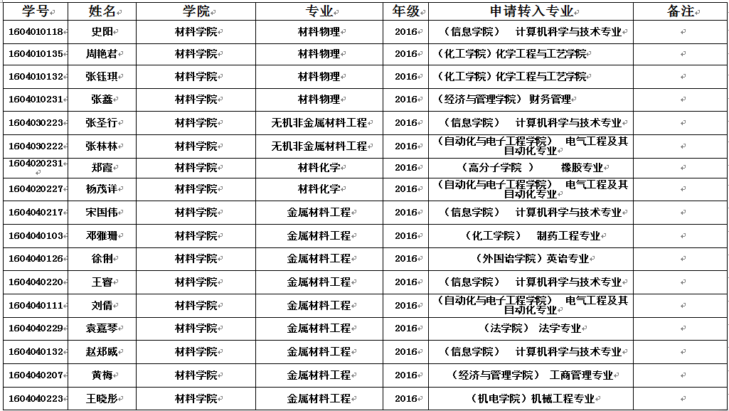 材料公司2016级申请转专业人员名单公示