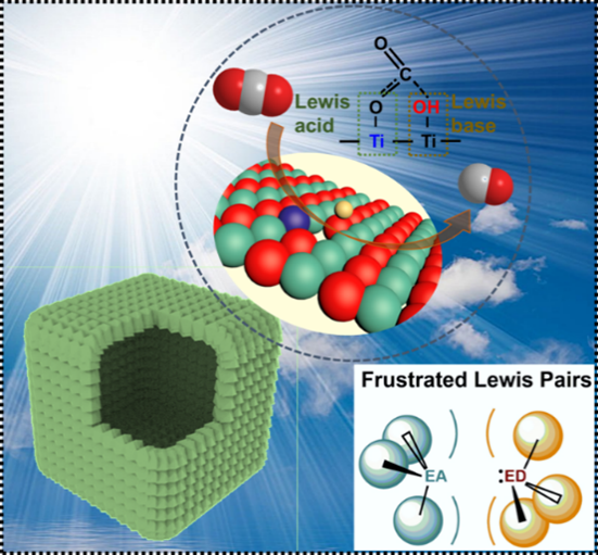 此外,该团队为探索光催化剂面临的其表面对CO2分子弱的吸附和活化能力,严重阻碍光催化CO2还原效率的问题,设计了含有受阻路易斯对(FLPs)的分层级中空TiO2-x空心盒子高效光催化剂,实现了无牺牲剂、无助催化剂条件下的水相高效光催化CO2还原。该工作通过利用原位拓扑转换方法将钙钛矿微米立方块成功构筑成含有受阻路易斯对(FLPs)的分层级中空TiO2-x空心盒子,TiO2-x表面的FLPs是由OVs(Lewis酸位点)及其近端表面羟基(Lewis碱位点)构成。含有FLPs活性位点的催化剂表现出出色的CO2吸附和活化能力,继而呈现优秀的光催化还原CO2为CO的活性。这一发现为在单组分固体光催化剂表面通过原位拓扑变换构建FLPs开辟了一条新途径,也为构筑高效的太阳能转化为化学能的光催化剂提供了新方法。该科研成果以“Construction of frustrated Lewis pairs on TiO2-xderived from perovskite for enhanced photocatalytic CO2reduction”为题,发表在化工领域TOP期刊Chemical Engineering Journal上(Chemical Engineering Journal, 2022, 427, 131554.https://doi.org/10.1016/j.cej.2021.131554)。该成果bv伟德中国官方网站为唯一通讯单位。