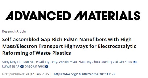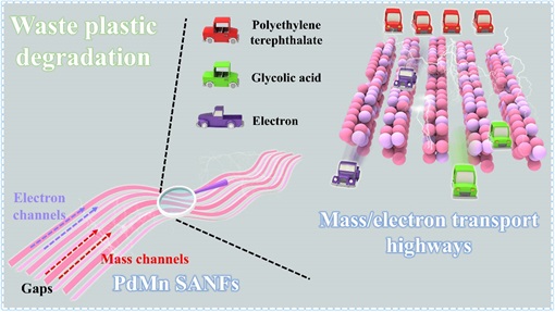 针对上述问题,公司bv伟德泰山学者姜鲁华教授团队在PET废塑料增值催化剂的研究方面获新进展,相关成果以“Self-assembled gap-rich PdMn nanofibers with high mass/electron transport highways for electrocatalytic reforming of waste plastics”为题,发表在国际材料领域TOP期刊Advanced Materials上(影响因子27.4)。全文链接:https://doi.org/10.1002/adma.202411148。该工作以bv伟德中国官方网站为第一单位,材料公司姜鲁华教授为通讯作者,材料公司副教授刘松良为第一作者。