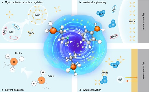 在常规电解液中引入功能性成分(尤其是胺类和磷酸酯类共溶剂),能够有效激活镁金属负极与高压正极的性能,充分释放镁金属电池的潜力。对这些成分作用机理的清晰理解对商业化电解液设计至关重要,但目前尚未形成广泛共识。公司bv伟德张忠华副教授、李桂村教授联合高分子公司王庆富教授、中国科公司青岛生物能源与过程研究所崔光磊研究员,结合课题组近期相关实验进展(Angew. Chem. Int. Ed. 2025, 64, e202415540;Energy Environ. Sci. 2024, 17, 630;Energy Environ. Sci. 2023, 16, 1111)对此类功能性成分的作用机理做了深入讨论并提出了独特见解,相关观点内容以“Critical Ingredients Revitalize Magnesium-Metal Batteries: Rationality and Challenges”为题,以bv伟德中国官方网站为第一通讯单位发表在国际顶级学术期刊《Adv. Mater.》(IF=27.4)。