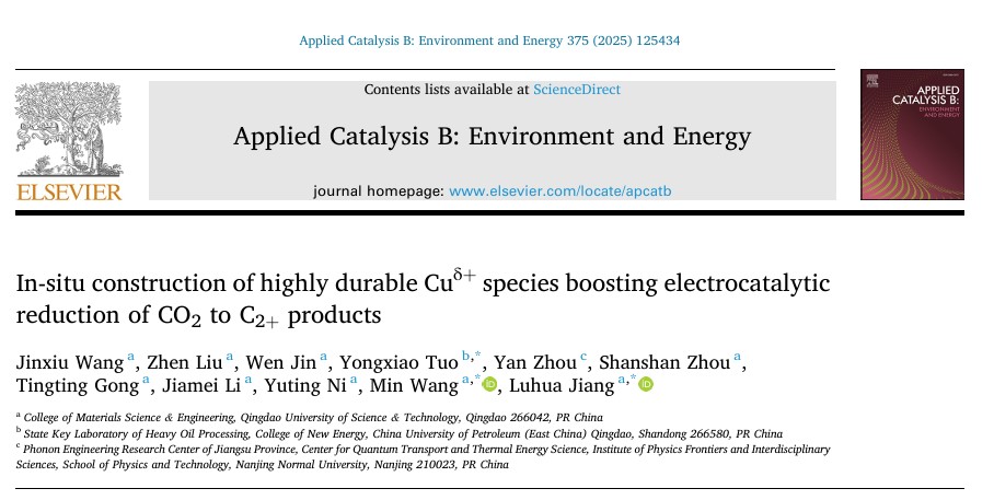 针对以上问题,公司bv伟德泰山学者姜鲁华教授团队在电催化CO2还原方面取得新进展,相关成果以“In-situ construction of highly durable Cuδ+species boosting electrocatalytic reduction of CO2to C2+products”为题,发表在国际环境催化领域TOP期刊Applied Catalysis B: Environment and Energy上(影响因子20.3)。全文链接:https://doi.org/10.1016/j.apcatb.2025.125434。该工作以bv伟德中国官方网站为第一单位,材料公司硕士研究生王瑾绣为第一作者,材料公司王敏副教授、姜鲁华教授,中国石油大学(华东)脱永笑副教授为共同通讯作者。