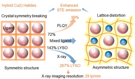 有机金属卤化物发光晶体材料在X射线闪烁体成像、LED等领域展现出巨大的应用潜力。基于铜(I)的金属卤化物因其高效的自俘获激子(STE)发射而成为极具前景的发光体。然而,STE发射的辐射效率主要由结构畸变决定,这使得精确控制这种畸变以实现最佳发光效果变得十分困难。在此,受对称性破坏原理的启发,居佃兴副教授与李慧芳教授合作,通过混合配体工程开发了一种通用的非对称结构转换策略,以调节结构畸变并增强分子内电荷转移,从而提高辐射性STE发射。机理研究表明,这种混合配体方法有效地调整了键长和角度,增强了结构畸变,同时促进了电荷转移,从而提高了发光性能。通过优化结构畸变,(C8H20N)1(C12H28N)1Cu4Br6晶体的发射效率提高了138%,其光致发光量子产率(PLQY)接近100%。因此,辐射发光增强了187%,达到了LYSO发光的2.67倍。由于这种显著的辐射发光性能提升,大面积的(C8H20N)1(C12H28N)1Cu4Br6单晶薄膜展现了出色的X射线成像性能,空间分辨率超过了29 lp/mm。这项工作将混合配体工程确立为一种有效的结构不对称设计方法,并展示了该材料在先进辐射检测和成像方面的潜力。相关成果以“Mixed-Ligand-Induced Crystal Symmetry Breaking and Lattice Distortion in Hybrid Cu(I) Halides for Near-Unity Quantum Yield Scintillators”为题发表在国际著名期刊Angewandte Chemie International Edition上(Angewandte Chemie International Edition, 2025, e19379,https://doi.org/10.1002/anie.202519379)。