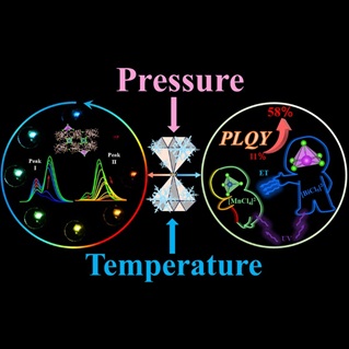 除此之外,居佃兴副教授联合郑州大学王玲瑞教授,郭海中教授及吉林大学邹勃教授,深入研究双金属卤化物发光晶体在极端刺激条件下的光学和物理特性。双金属卤化物兼具单金属卤化物和多金属体系的优点,能够实现可调的发光效果、高效率和稳定性,适用于光电子学领域。基于此,我们设计了一种新型双金属卤化物—(C8H20N)4MnBiCl9,并研究了其在极端刺激条件下的光学和物理特性。在高达10.0 GPa的压力下,其发光颜色从蓝色(常温)变为红色,且在较低温度下强度增加。在1.8 GPa时,实现了高达58%的高光致发光量子产率(PLQY),比常温高出5倍以上。在常压下,观察到在130 - 470 K范围内有强烈的发光响应,显示出对压力和温度的双重响应特性。压力引起的[BiCl5]2−和[MnCl4]2−多面体的变形以及单位间距离的减小,增强了能量转移,从而产生了更强的发光和颜色变化。这些特性突显了其在极端环境中用于信息加密、光学传感和系统校准的潜力。相关成果以“Dual-stimuli tunable multi-color emission and energy transfer in a manganese bismuth bimetallic halide”为题发表在国际著名期刊Matter上(Matter, 2025, 102520, DOI: 10.1016/j.matt.2025.102520)。上述研究均获得国家自然科学基金、山东省自然科学基金等项目的资助。