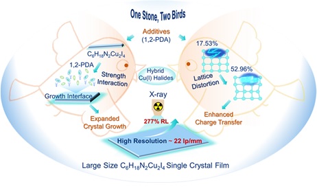 X射线成像技术在疾病诊断、安全检测等方面得到了广泛的应用。闪烁体是X射线成像技术的核心部件。过去几十年间,技术的进步催生了多种闪烁体的出现,包括无机闪烁体和有机闪烁体,它们已在X射线成像中得到广泛应用。近年来,溶液可处理的离子型有机Cu(I)基卤化物在X射线闪烁体成像领域展现出巨大的应用潜力。然而,该类材料的进一步应用面临巨大挑战。在此,居佃兴副教授针对离子型有机Cu(I)基卤化物闪烁体面临的两大挑战展开研究:一是金属与配体之间的电荷转移不足,导致发光效率受限;二是晶体生长的各向异性,使得大面积单晶闪烁屏难以制备。在理论计算的指导下,我们提出一种“一石二鸟”的分子策略,在C₆H₁₈N₂Cu₂I₄体系中引入中性的1,2-丙二胺(1,2-PDA)作为双重功能添加剂。系统的机理研究表明,1,2-PDA不仅增强了有机配体(C6H18N22⁺)与铜(I)卤化物簇之间的离子相互作用,促进了晶体界面处的定向聚集,还在缺陷掺入时诱导晶格显著变形,从而增强了电子-声子耦合,提升了自俘获激子(STE)的发射效率。得益于上述机制,材料的光致发光量子产率(PLQY)提高了3倍(从17.53%提升至52.96%),辐射发光强度也增强了2.77倍。此外,我们成功制备出大面积单晶薄膜(约10 × 7 × 0.31 mm3),其X射线成像分辨率达到22.3 lp·mm⁻¹的优异水平。该方法可广泛适用于多种混合金属卤化物体系,在提升晶体维度与闪烁性能的同时,也为高性能辐射探测材料建立了一套通用的分子设计准则。相关成果以“Boosting Crystal Growth and Radioluminescence in Hybrid Cu(I) Halide Scintillators via Additive-Strengthened Ionic and Electron-Phonon Interactions”为题发表在国际知名期刊《Angewandte Chemie International Edition》上,并被选为“Hot Paper”。(Angew. Chem. Int. Ed. 2025, e25951doi.org/10.1002/anie.202525951)。居佃兴副教授和李慧芳教授为通讯作者,bv伟德中国官方网站为唯一通讯单位。