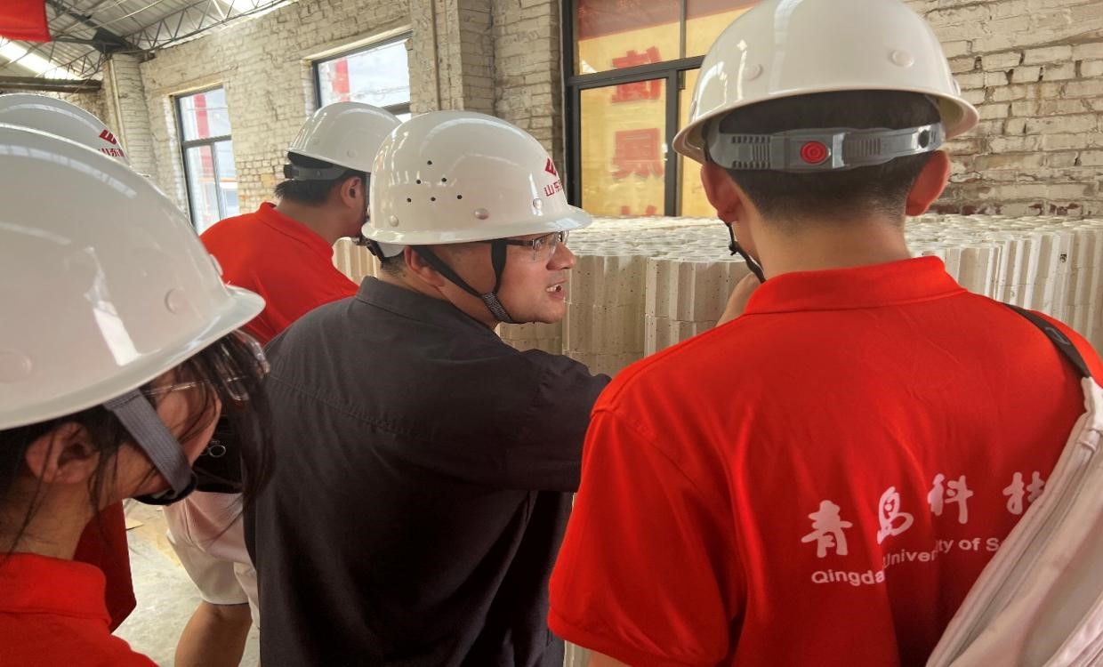 在团队成员了解到该企业的发展历史与特色文化后,企业工作人员继续带领我们到鲁耐窑业进行实地感受。该窑业以铝硅系耐材为主,主要产品有粘土质、高铝质、烧结法合成高级原料、特殊耐火材料、不定型耐火材料等。年生产能力10万余吨,有优质粘土高铝砖生产线两条;红柱石砖、莫来石砖生产线两条;碳复合耐火材料生产线一条;合成莫来石砂生产线一条;高档轻质制品生产线一条;纯氧化物耐火材料生产线一条;不定形耐火材料生产线。在此过程中,团队成员见识到各种大规模的工艺设备,了解到耐火材料完整规范的生产线,将理论知识与生产实际充分结合,熟悉了耐火材料的发展方向及应用领域,同时明确了材料相关专业的光明前景。
