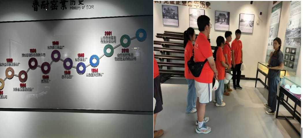 企业工作人员为了帮助调研团加深对公司文化、工艺装备的理解,带领团队成员参观了公司文化馆。在了解山东耐火材料背景时,历史的滚轮从远方呼啸而过。1904年清政府投资成立“博山玻璃公司”,1917、1958、2001、2003……经历了数次变革合并但在今天2023仍然为中国材料业的发展起着重要定向作用。在这里,团队成员通过珍贵的历史照片、实物展示和文献资料,一步步走近了解了山东耐火材料集团的发展历程。创业初期的辛勤耕耘、风雨飘摇中的艰辛坚守,以及如今的技术创新和市场竞争,都成为团队成员瞩目的焦点。在历史展览馆里,团队成员深刻感受到企业秉承创业初心,不断前行的坚韧品质,这也激发了他们对企业历史和产业文化的兴趣。