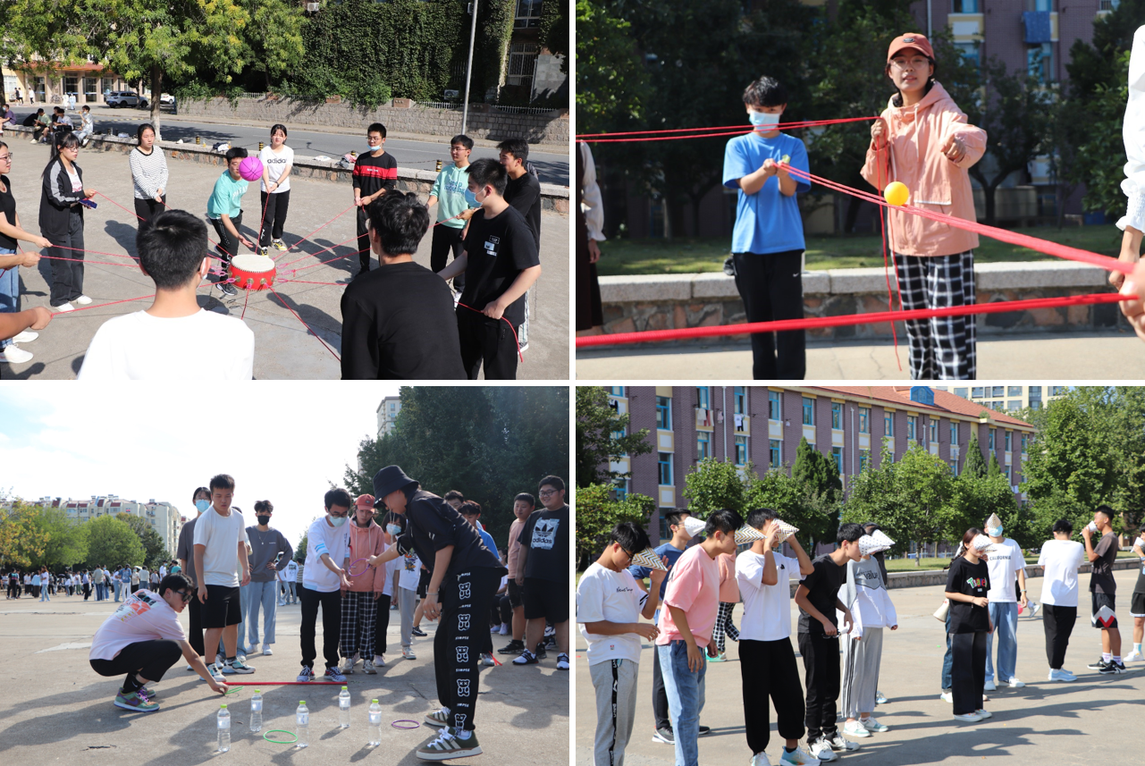 在“不倒森林”游戏中,同学们们极具默契与速度,短时间内快速移动到下一个杆并用右掌心扶住,做到人动杆不动;在“扔沙包”游戏中,同学们的速度与眼力极佳,12个人在场上灵活躲避沙包;在“谁是队长”游戏中,同学们速度与反应能力,不同队伍绑不同颜色的气球并选出队长,每人脚上绑一个气球,队员气球全部被踩爆或者队长气球被踩爆的队伍失败;在“三角帽大作战”中,气氛紧张,同学们以极强的平衡能力和方向感穿过绳索,并夺取气球。在“同心击鼓”游戏中,一鼓十二绳将胜负聚于一点,同学们团结一致、集中精力投入那被抛起的球中,三声响定胜局;在“轨道传球”游戏中,同学们目聚黄球,手握红绳,黄球缓缓移动带动起同学们紧张的情绪,一棒接一棒;在“井字棋”游戏中,同学们一套既中,又以极佳的体力,一骑绝尘,下好本队的每一步旗,有勇有谋,团结一致。