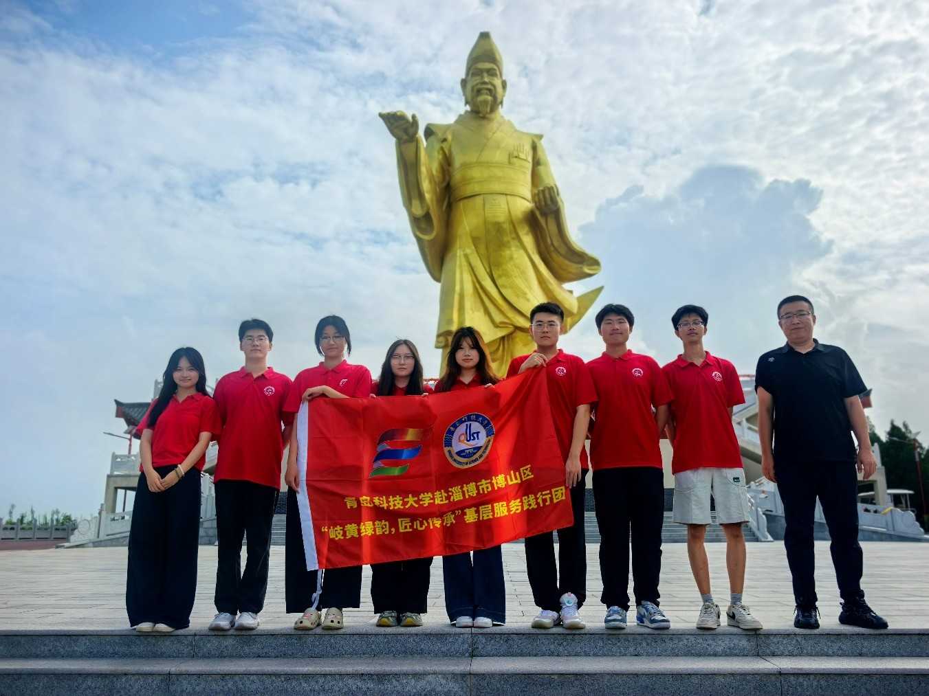 赴淄博市博山区“岐黄绿韵,匠心传承”社会实践服务队在扁鹊像前合照