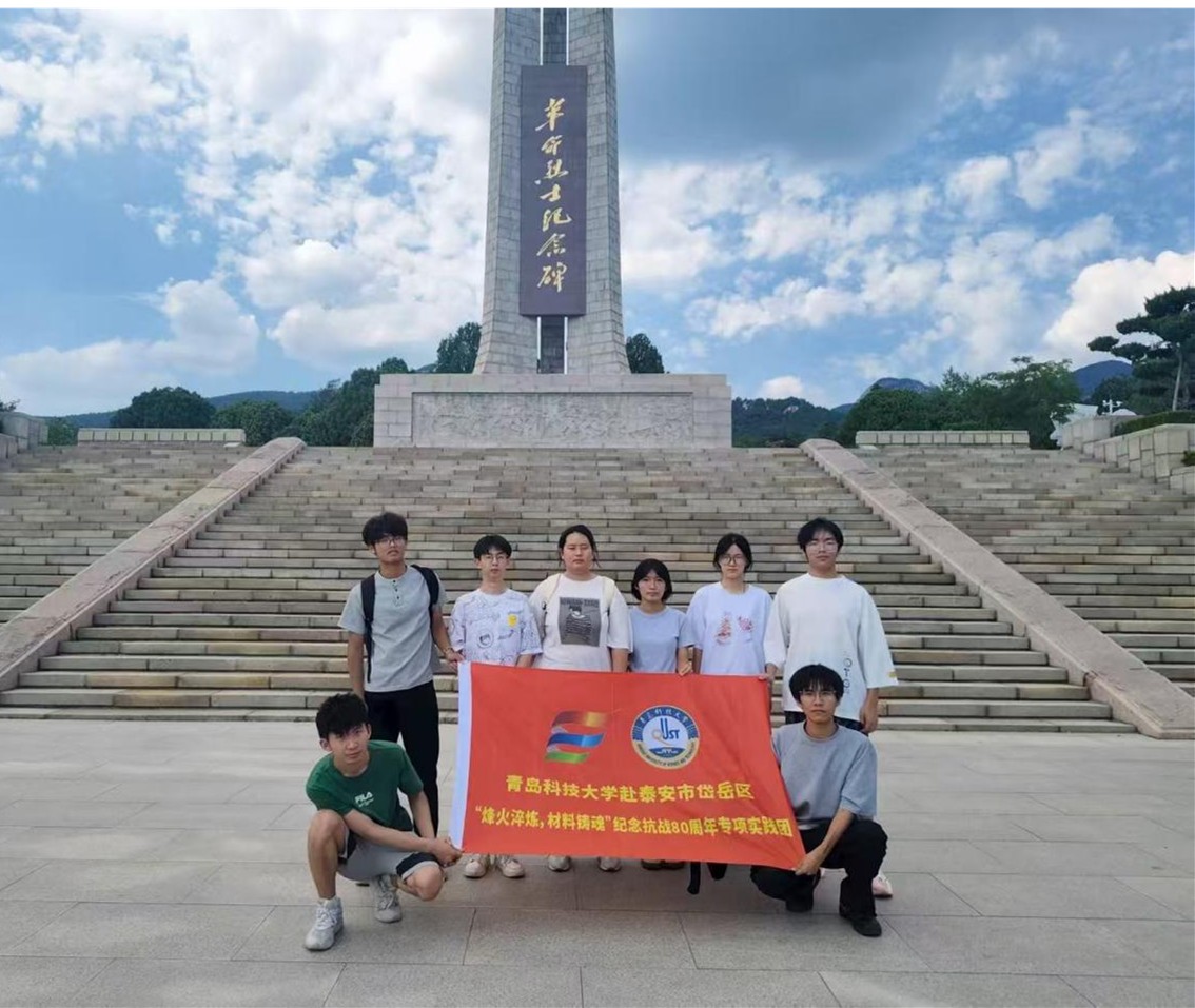 赴泰安市岱岳区“烽火淬炼,材料铸魂”实践团在徂徕山抗日武装起义纪念碑与旧址前合照