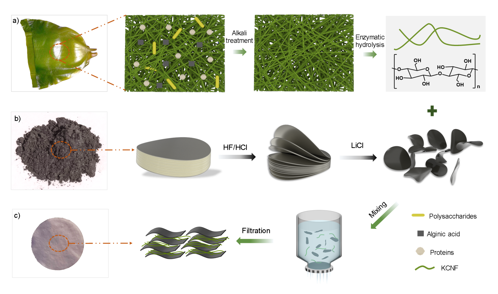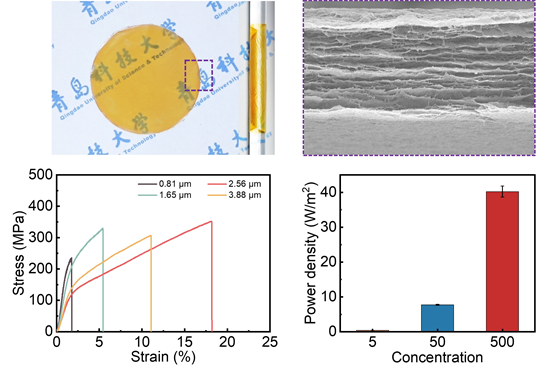 同时,考虑到合成纤维的成本昂贵、不易获得等弱点,为此,滕超副教授将目光投向自然界,寻找一种生长周期短、储量丰富、易于获得的天然海带,将提取的带负电海带纳米纤维与MXene纳米片复合,制备力学性能提高、溶液稳定的KCNF/MXene纳米复合材料,实现高效盐差能量捕,相关工作以题为“Kelp Nanofiber-Based Composite Membranes for Highly Efficient Osmotic Energy Conversion”的研究性论文发表在国际著名期刊Advanced Functional Materials上(2023,DOI: 10.1002/adfm.202313914,accepted)。bv伟德中国官方网站材料公司2021级硕士研究生翟瑞为本文的第一作者,滕超副教授为通讯作者。