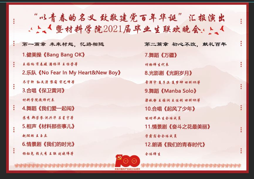 晚会分为“未来材起,忆路相随”和“初心不改,献礼百年”两个篇章,在2020级新生带来的健美操《Bang Bang OK》中拉开帷幕,朝气蓬勃、青春向上的新生力量展示了“材料追梦人”姿态;乐队演奏的《No Fear In My Heart》《New boy》,在畅想回味大学四年求员工涯的美好同时,也表达了勇于面对未来的决心;教师代表以及全体员工共唱的《保卫黄河》,发出了保卫国家和捍卫公司、公司荣誉的“青春之声”;舞蹈《我们爱一起闯》《Manba Solo》,展现出了老员工的青春风采,活力四射,动感十足,象征毕业生在新征程中将一路高歌,披荆斩棘;幽默搞笑的小品表演《材料那些事儿》让现场气氛高涨、掌声不断;情景剧《我们的时光》、光影剧《光阴岁月》同学们以自身学习成长经历诉说了对母校对老师们的感恩之情;由材物专业师生代表组合表演的舞蹈《万疆》编排精致,舞姿典雅优美,表达了师生对党和祖国的无限敬仰热爱之情;合唱节目《起风了少年》表达了毕业生们对母校和同窗的深厚的感情,博得了观众们雷鸣般的掌声;情景剧《奋斗之花最美丽》致敬材料公司纳米夫妇,他们的艰苦奋斗经历深深感染了在场师生,晚会在全体师生朗诵的《我们的青春时代》《少年中国说》节目中圆满落幕,展示了以青春的姿态传递正能量,致敬建党百年华诞的“青春力量”。